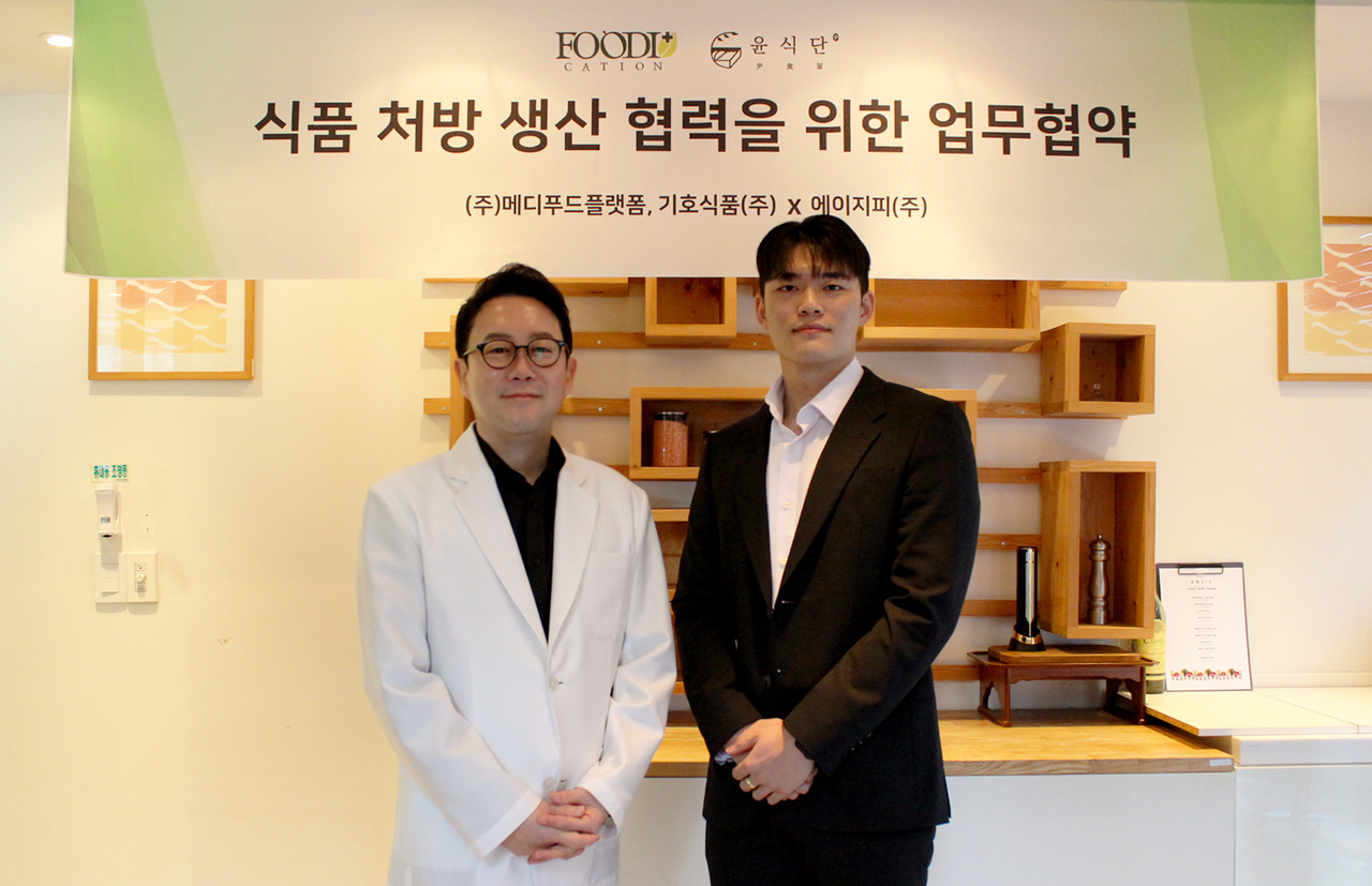 디지털 헬스케어 기업인 메디푸드플랫폼과 에이지피가 8일 인사잇 솔루션의 식품 처방 서비스 확대를 위해 업무협약을 체결했다.