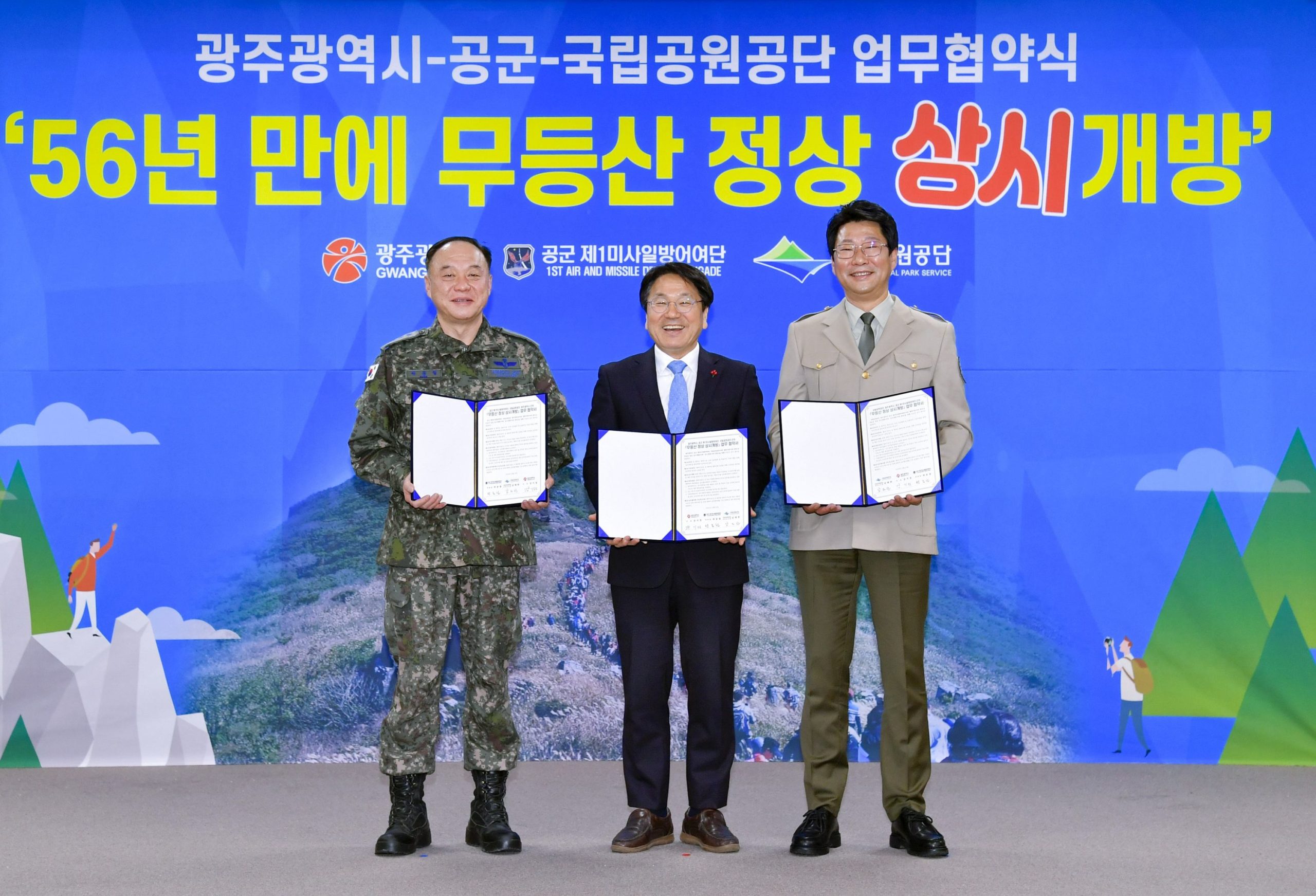 광주광역시가 공군 제1미사일방어여단, 국립공원공단과 함께 20일 ‘무등산 정상 상시 개방을 위한 업무협약’을 체결했다. 협약에 따라 1966년 공군 주둔으로 오르지 못했던 무등산 정상이 2023년 9월부터 시민의 품으로 되돌아오게 된다.