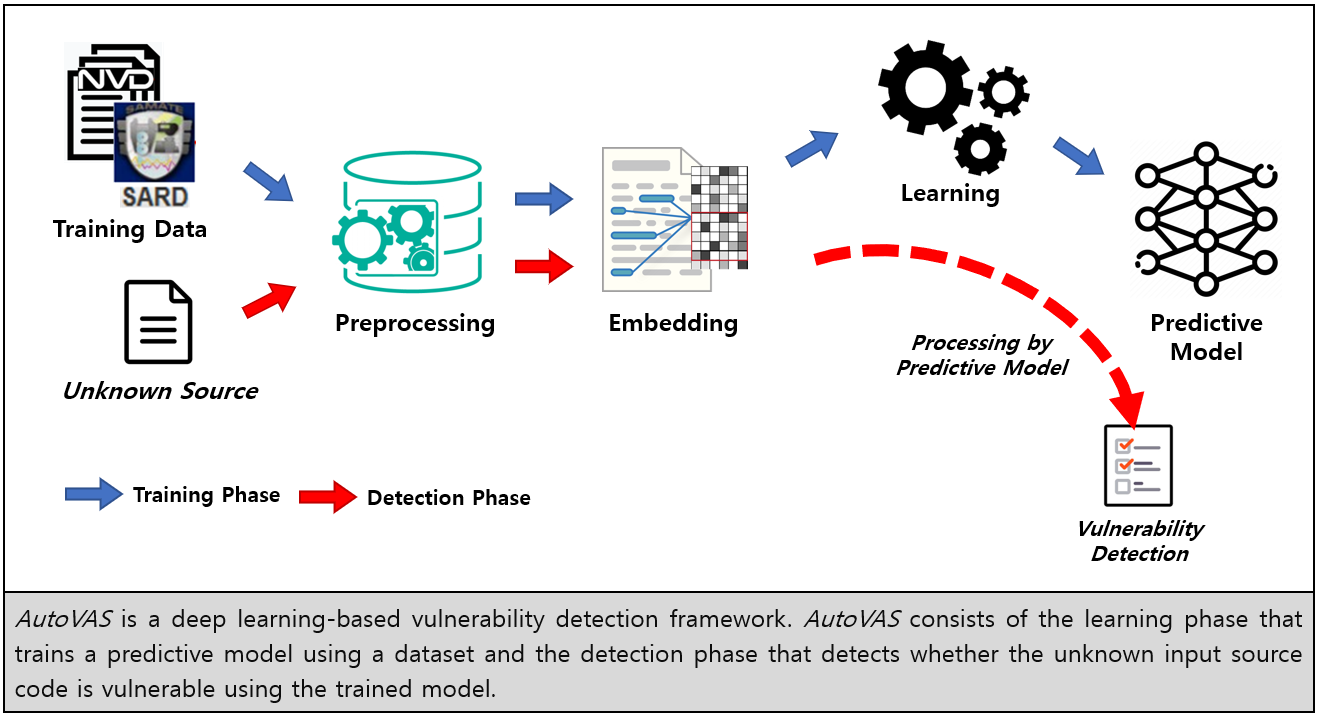 케이사인이 기술이전을 받게 될 AutoVAS(An automated vulnerability analysis system with a deep learning approach)시스템은 고려대학교 김휘강 교수 연구팀(해킹대응기술연구실)이 고안한 것으로 보안상 취약한 소프트웨어의 예시코드가 담겨있는 SARD 데이터셋을 이용하여 딥러닝으로 학습하고, 프로그래밍 언어의 소스코드 상에 존재하는 취약점을 자동으로 찾아주는 기술이다.