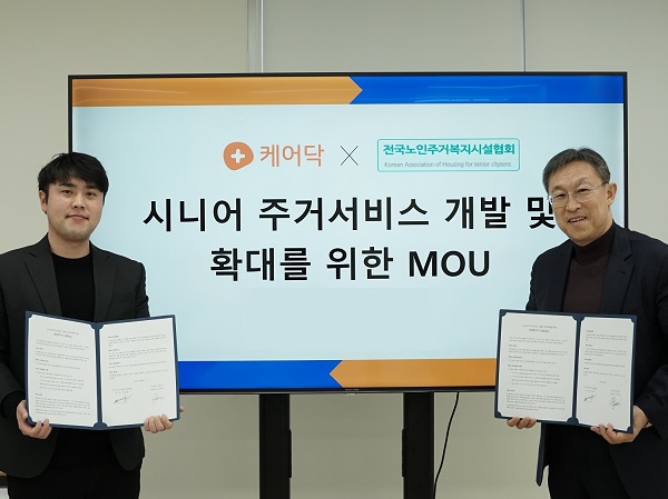 시니어 돌봄 플랫폼 케어닥과 전국노인주거복지시설협회가 시니어 돌봄 환경 확충을 위해 ‘시니어 주거 서비스 개발 및 확대를 위한 업무협약을 체결했다. 본 협약을 통해 양사는 ▲시니어 주거산업 확장 ▲주거시설 맞춤형 케어 서비스 개발 ▲시니어 라이프 및 건강 등 데이터 상호 활용 등의 업무를 협력해 나갈 방침이다.