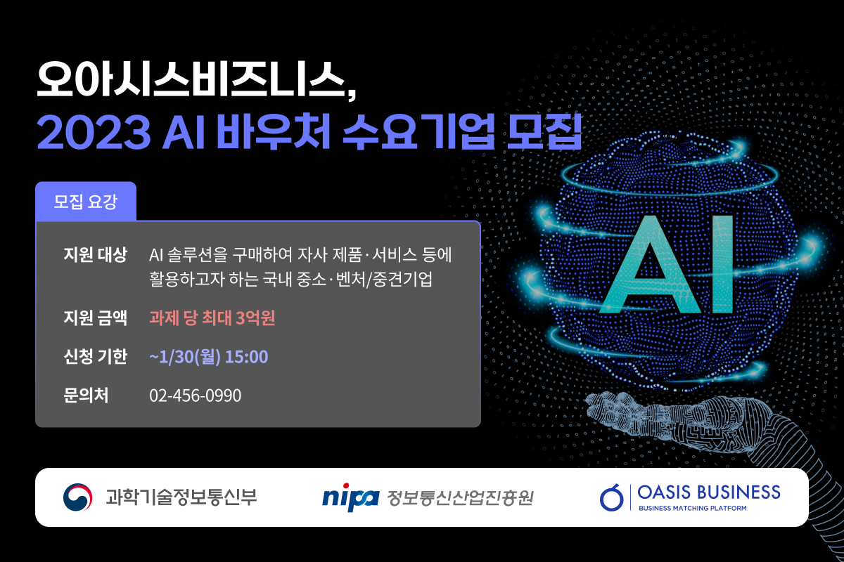 오아시스비즈니스가 2023 AI 바우처 지원사업에 공급기업으로 선정되어 AI 솔루션을 도입할 수요기업 모집을 시작한다.