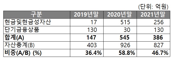 비교적 단기간에 현금화할 수 있는 자산인 현금및현금성자산, 단기금융상품이 전체 자산에서 큰 비중을 차지하고 있으며, 2021년말 기준 전체 자산의 약 47%를 구성하고 있습니다. 2020년말 Series-D 투자금 유입으로 현금성 자산이 크게 증가했으며, 2021년말에는 투자금을 사업 확장 및 인력 채용 등의 목적에 사용함에 따라 일부 감소하였습니다.