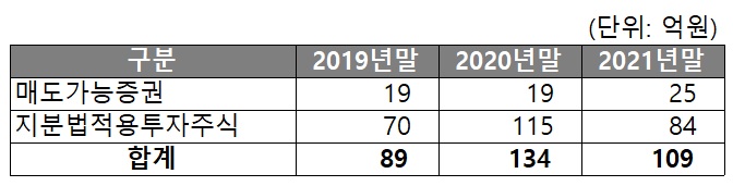 3. 투자자산은 2021년말 기준 약 100억원 수준입니다.