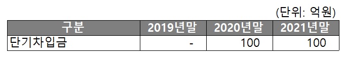 차입금은 2020년에 기업은행으로부터 차입한 운전자금대출 100억원이 존재합니다.