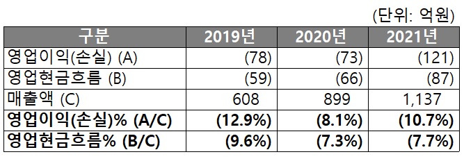 가파르게 성장하는 매출에 비해, 수익성은 좋지 못한 편입니다. 매출대비 연평균 약 10% 수준의 영업손실이 발생하고, 8% 수준의 영업현금흐름 손실이 발생합니다. 수익성이 좋지 않은 사유에 대해서는 하기 영업비용 분석에서 후술하겠습니다.