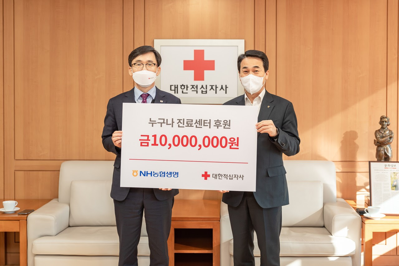 NH농협생명은 16일 서울 중구 대한적십자사 서울사무소를 찾아 의료소외계층이 무료 진료를 받을 수 있도록 대한적십자사에서 운영중인 ‘누구나진료센터’에 기부금 1천만원을 전달했다. 전달된 기부금은 대한적십자사의 ‘누구나진료센터’ 를 통해 ▲건강보험 미적용 노숙인 ▲기초생활수급자 ▲난민 등 의료취약계층을 대상으로 무료 진료 및 건강검진 사업에 사용될 예정이다.