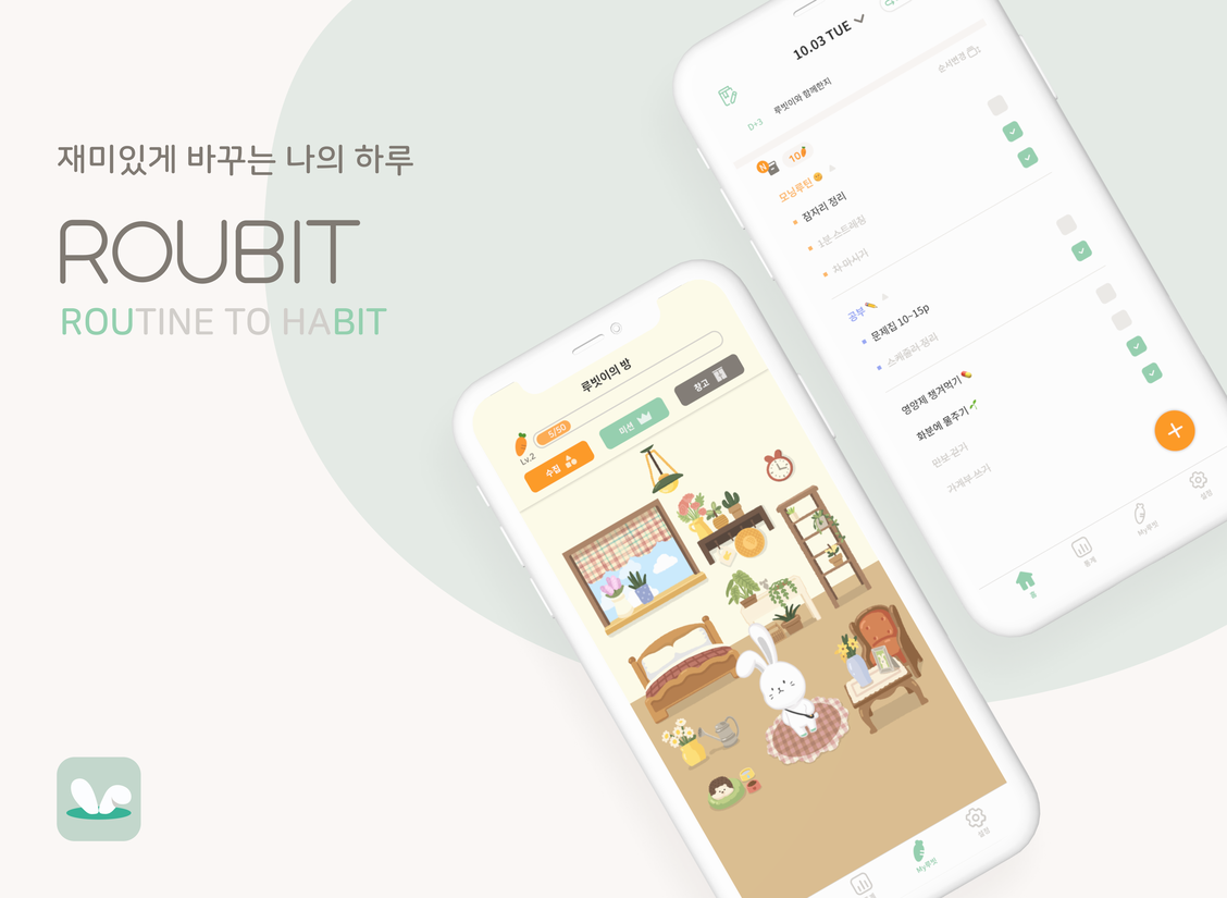 한편 루빗은 루틴 관리를 통해 이를 해결해 주고 게임형 보상을 통해 사용자의 습관 형성을 돕는 앱 서비스이다. 기존 루틴 앱은 부지런한 사람이 주요 타깃이었다면, 루빗은 게임형 보상을 통해 의지력이 약한 사람도 쉽게 생활습관을 만들 수 있다.