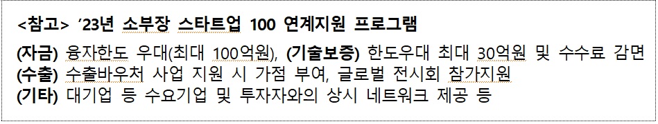 ‘소재‧부품‧장비 스타트업 100’은 3高 복합위기 등 글로벌 공급망 위기 상시화에 대응하기 위해 소재‧부품‧장비 분야 유망 창업기업을 발굴하여 기술자립을 지원하는 사업으로 중소벤처기업부는 ’20년부터 매년 20개씩 60개사를 선정하여 수입품목 국산화 등을 지원했다. ’23년에는 40개사를 선정하여 ’소부장 유망 스타트업 100개’ 발굴 목표를 1년 앞당겨 조기 달성할 계획이다.