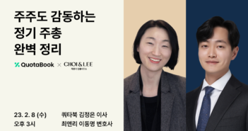 증권 관리 플랫폼 쿼타북과 스타트업 전문 최앤리 법률사무소가 2월 8일 정기 주주총회 웨비나를 개최한다. ‘주주도 감동하는 정기 주총 완벽 정리’라는 제목으로 진행되는 이번 웨비나에서는 비상장 주식회사가 챙겨야 할 정기 주주총회의 모든 것을 쉽고 정확하게 알려준다. 진행은 벤처캐피탈 심사역 출신의 쿼타북 김정은 이사와 스타트업 전문 최앤리 법률사무소의 이동명 변호사가 맡았다. 이번 웨비나에서는 ▲정기 주총 필수 요건·안건 ▲정기 주총 실무 타임라인 ▲우리 회사에 꼭 맞는 정기 주총 방식 찾기 등 3월 정기 주주총회를 위한 필수 사항을 스타트업 전문가와 함께 살펴보고, ▲주주도 감동하는 정기 주총 커뮤니케이션 노하우까지 공유받을 수 있다. 신청은 이벤터스를 통해 할 수 있으며 현재 선착순 300명 얼리버드 무료 신청이 가능하다. 참가자에게는 정기 주주총회 문서 양식 패키지, 실무 가이드북, 1시간 법률 상담 바우처 등 혜택이 주어진다. 진행을 맡은 쿼타북 김정은 이사는 "매년 3월 다수의 주주총회에 참가하느라 정신없이 바쁜 와중에 기본 요건을 완벽하게 챙기면서도 투자자의 입장까지 세심하게 배려하며 주주총회를 진행하는 회사에 감동 받았던 경험이 있다"며 "기초적인 절차부터 시작해서 주주에게 신뢰와 감동을 전하는 노하우를 공유하고 싶다"고 말했다. 관련 기사 더보기 [embed]https://www.venturesquare.net/871042[/embed]