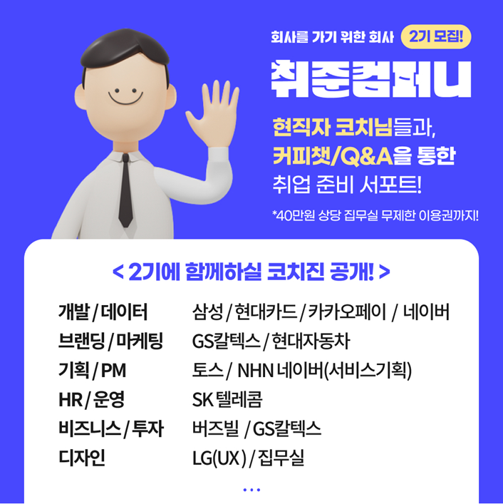 이번 2월 한달 동안 활동하는 취준컴퍼니 2기에 선발된 취업준비생에게는 삼성, 현대자동차, 네이버, 카카오, SK텔레콤 등 국내 유수 기업의 N년차 실무진 40명이 참여하는 멘토 프로그램이 준비됐다. 취업 준비생의 커리어 조언을 제공하는 다양한 직무의 코치진으로 구성된 멘토 프로그램은 온라인 또는 오프라인 집무실 지점에서 커피챗을 진행한다. 이들 코치진 또한 매월 기수마다 자발적 지원을 통해 이뤄진다.