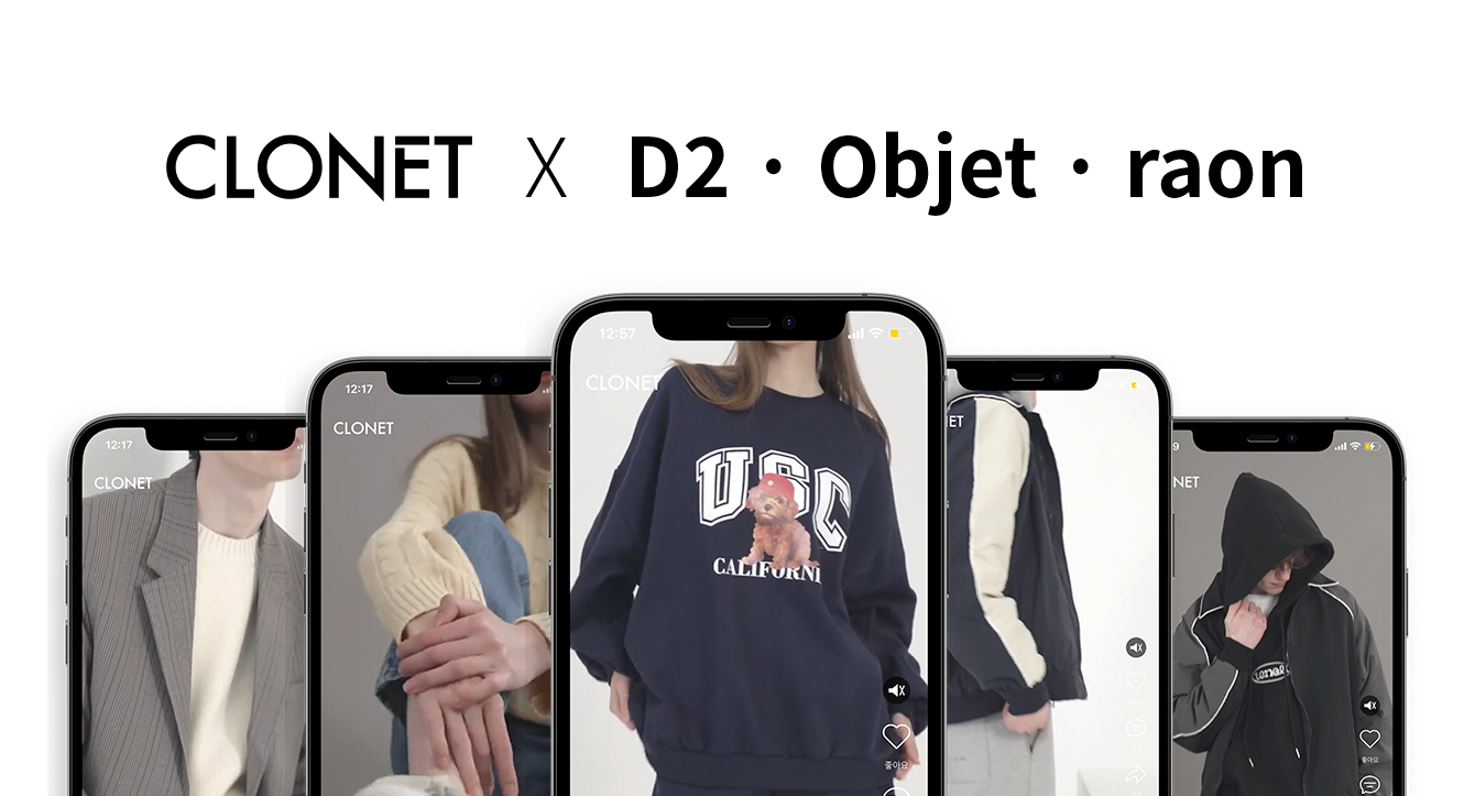 패션 숏폼 콘텐츠 솔루션을 제공하는 클로넷코퍼레이션 ‘클로넷‘은 글로벌 진출을 희망하는 동대문 유명 도매업체인 d2, objet, raon과 함께 콜라보레이션하여 하이퀄리티 패션 숏폼 영상 콘텐츠를 제작 했다.
