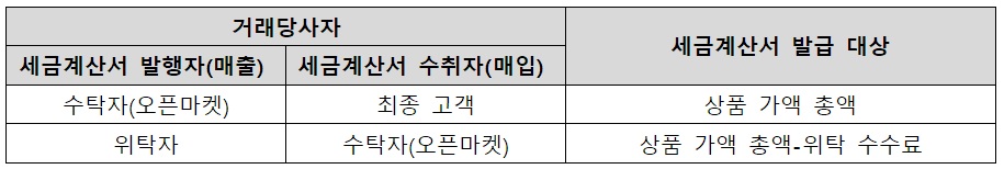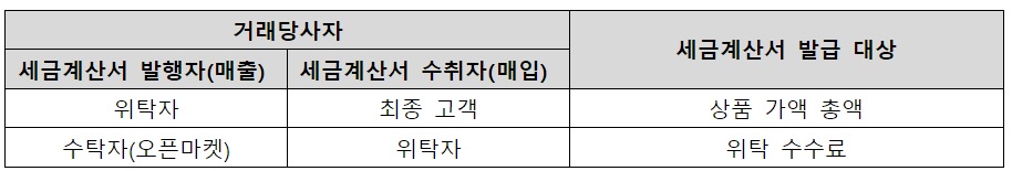 먼저 위탁매매의 경우 고객에 대한 매출에 대해 위탁자의 명의로 세금계산서를 발급하고 위ㆍ수탁자 간 수수료 관련 세금계산서를 발급ㆍ수취하는 것이 원칙이다. 위탁거래에 해당할 경우 올바른 세금계산서 발행은 다음과 같다
