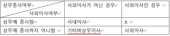 즉, 두 가지 기준(상무 종사 여부, 사외이사 여부)을 두고 이사의 종류를 표로 구분하면 다음과 같습니다.