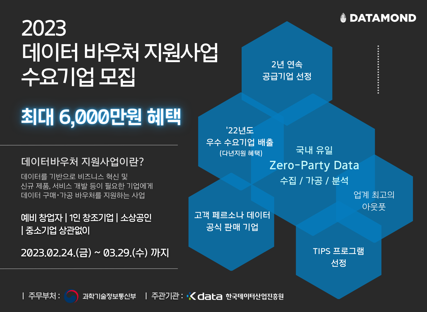 데이터 전문 기업 데이타몬드가 2022년에 이어 2023년에도 데이터바우처 지원사업의 공급기업으로 선정되었으며 현재 수요기업을 모집 중이다.