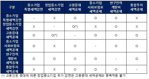동일한 과세연도에 동시에 적용 가능한 세액감면과 공제가 있는 경우, 중복 적용이 불가능한 경우가 있다. 상기 6개의 세액감면 및 공제의 중복적용 가능 여부를 검토하면 다음과 같다.