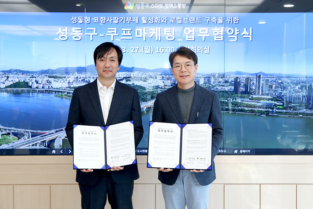 모바일 플랫폼 기업 쿠프마케팅이 성동구와 ‘성동형 고향사랑기부제 활성화와 로컬 브랜드 구축’ 업무협약을 체결했다.