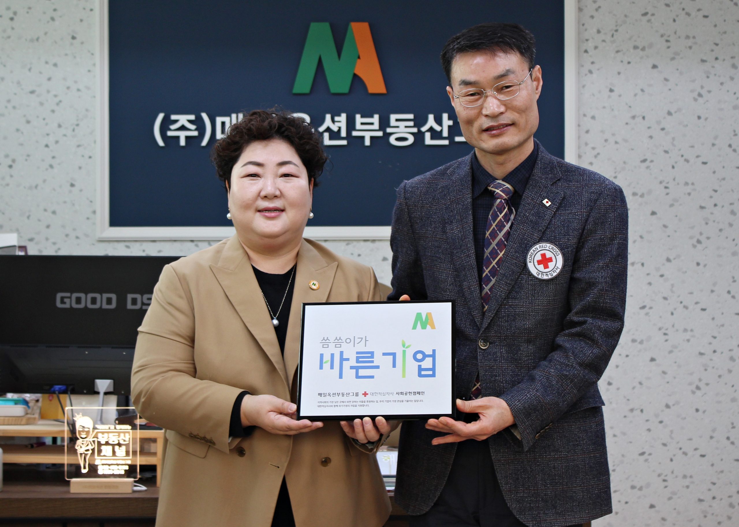 적십자사 서울지사는 서울 용산구에 위치한 법원경매 전문 토탈 서비스 기업 매일옥션부동산그룹을 방문해 ‘씀씀이가 바른기업’ 명패를 전달했다. 대한적십자사의 ‘씀씀이가 바른기업’ 캠페인은 지역사회를 위한 정기적인 기부를 실천하는 사업장에게 붙여주는 명칭으로, 후원금은 위기가정 및 취약계층을 위한 통합 복지 지원에 사용된다.