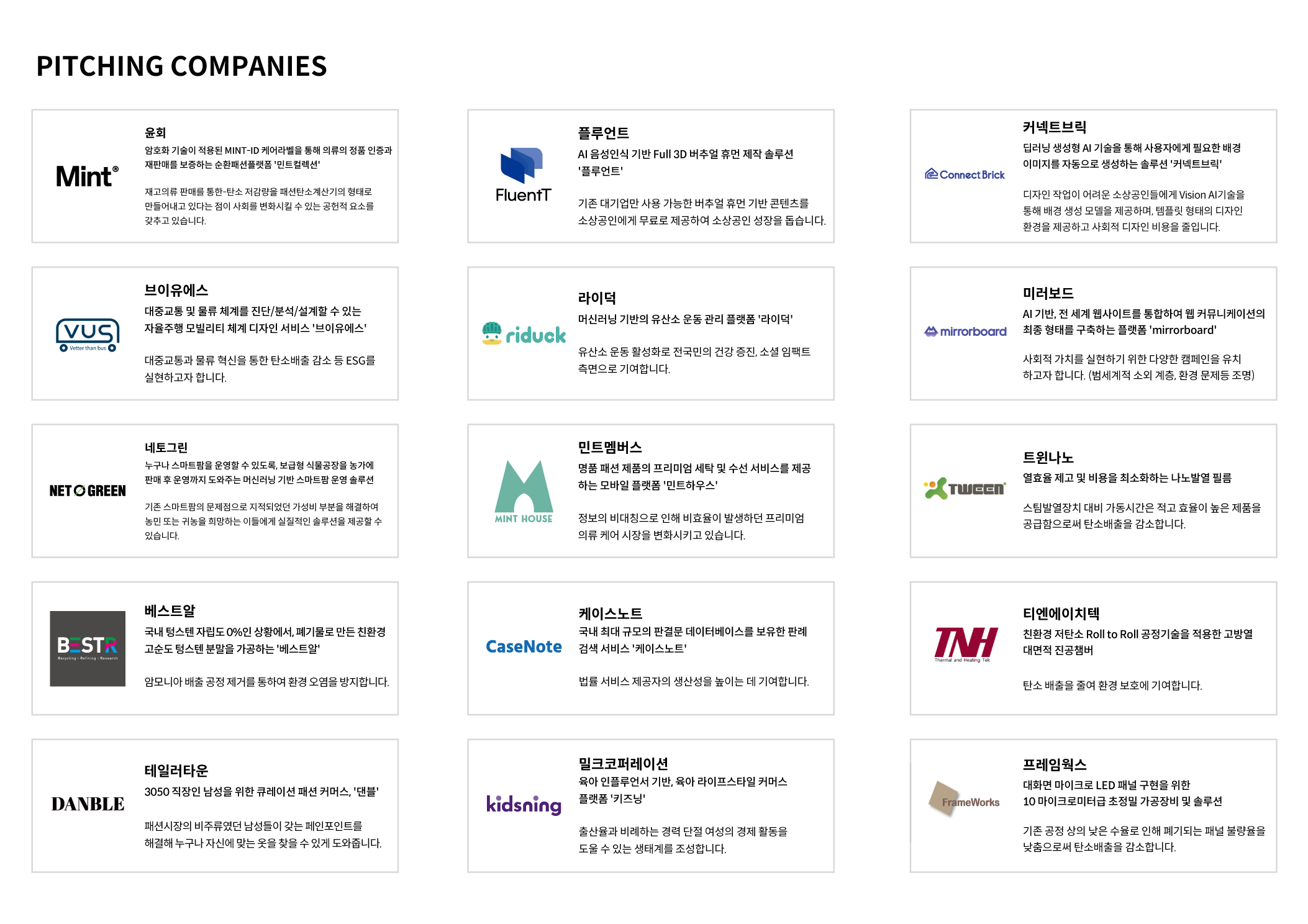 이번 데모데이에는 ‘바른동행 2기’ 23개사 중 15개 기업이 참가하여 다양한 분야에서 혁신적인 아이템을 선보였다. 브이유에스(폐기물 수거 경로 예측 솔루션), 민트멤버스(명품 패션 프리미엄 세탁 및 수선 서비스), 베스트알(폐기물을 활용한 텅스텐 추출 솔루션), 윤회주식회사(순환 패션 플랫폼), 커넥트브릭(이미지 생성 AI), 플루언트(AI 음성인식 기반 버츄얼 휴먼 제작 솔루션), 케이스노트(판례 검색 서비스), 프레임웍스(10 마이크로미터급 초정밀 가공 기술) 등 딥테크, SaaS, AI 를 포함한 다양한 분야의 스타트업이 참가했다.