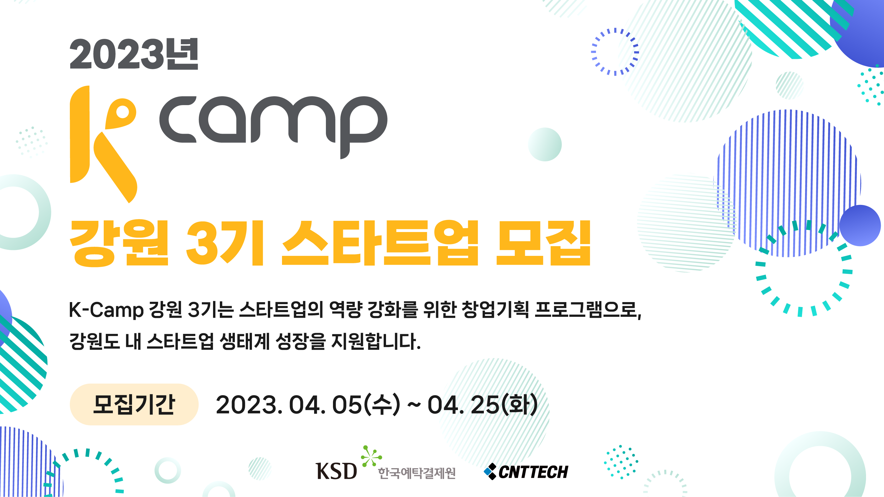 투자 전문 액셀러레이터 씨엔티테크가 ‘K-Camp 강원 3기 액셀러레이팅 프로그램’에 참가할 유망스타트업을 4월 5일부터 25일까지 모집한다.