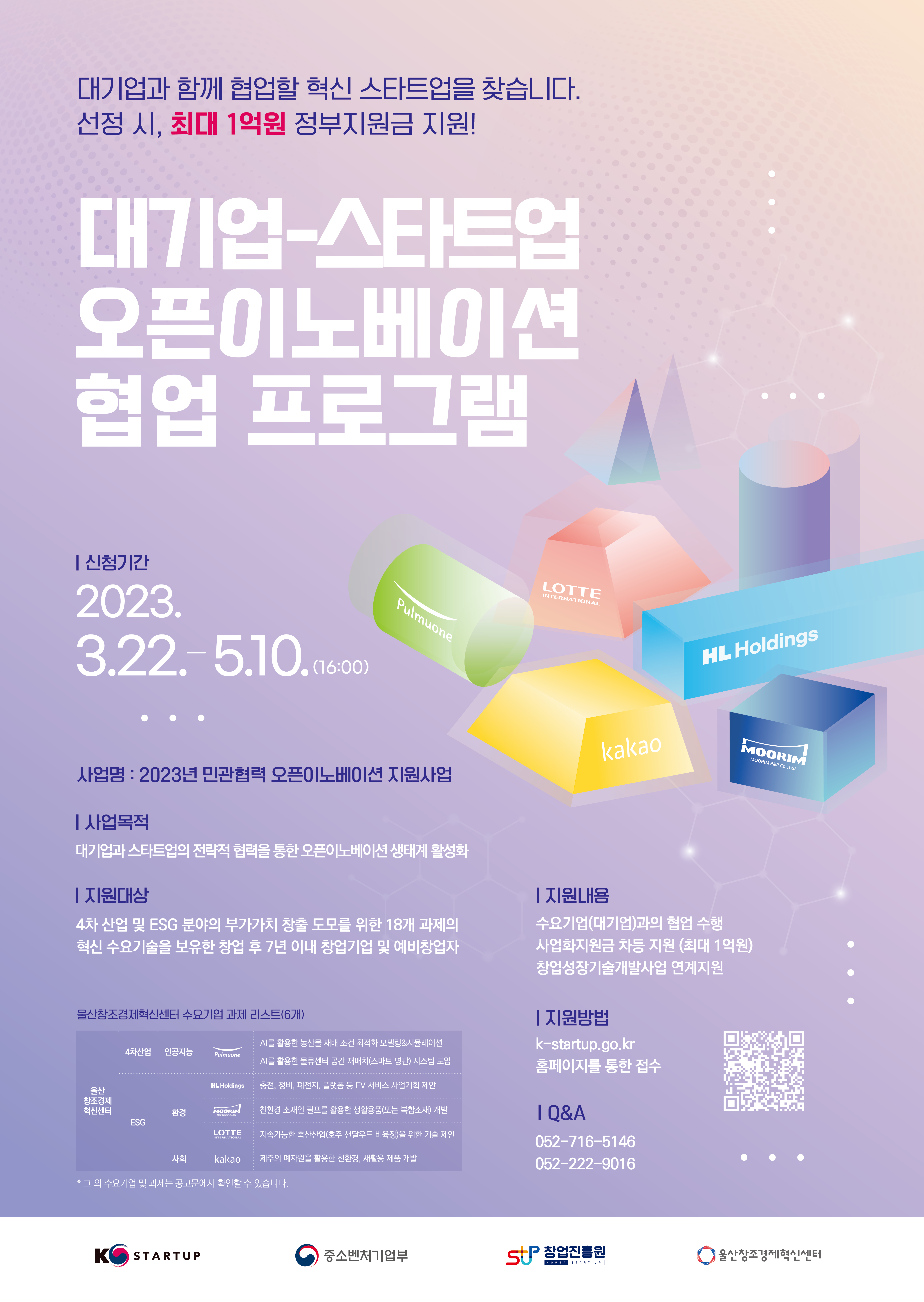 2023년 민관협력 오픈이노베이션 지원사업은 총 17개 대기업이 총 18개 과제로 스타트업에게 협업의 기회를 부여하는 사업이며 울산센터는 5개 대기업(풀무원, HL홀딩스, 무림P&P, 롯데상사, 카카오)과 함께 6개 과제로 스타트업의 혁신성장을 도모하게 됐다.