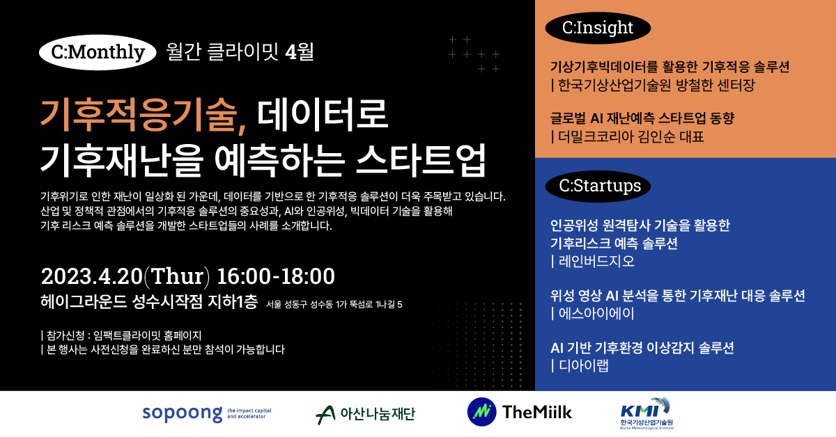 임팩트 투자사 소풍벤처스가 오는 4월 20일 ‘기후적응기술, 데이터로 기후재난을 예측하는 스타트업’이라는 주제로 월간클라이밋 세미나를 개최한다.