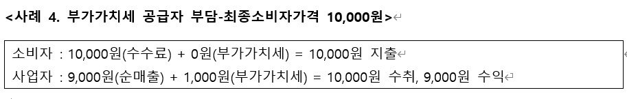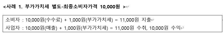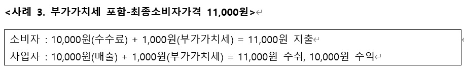 이 경우 사례 1과 세부담과 매출 발생액은 동일하다. 다만 소비자가 처음부터 부가가치세 포함인 가격으로 서비스의 대가를 인지하므로 결제 시점의 예상치 못한 부담은 발생하지 아니하며, 사업자 입장에서도 적정 서비스 대가를 수취하면서 소비자에게 받은 부가가치세를 대신 납부하게 되므로 손익에도 영향을 주지 않는다.