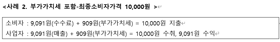 최종소비자가격인 10,000원에 부가가치세가 포함된 경우, 사업자의 매출은 10,000원이 아닌 9,091원이 되며, 차액인 909원은 부가가치세로 납부해야 한다. 부가가치세 포함이라고 별도로 기재되어 있지 않은 경우라도, 세법상으로는 받은 대가에 부가가치세가 포함되어 있는지가 분명하지 아니한 경우에는 일단 부가가치세를 포함한 금액을 수취한 것으로 보므로 효과는 동일하다. 만약 사업자가 판단한 적정 서비스 대가가 10,000원이라면 실제 사업자 수중에 들어오는 돈과 부가가치세분만큼 차액이 발생하므로, 사업자 입장에서는 손실을 보는 상황이 발생할 수 있다.