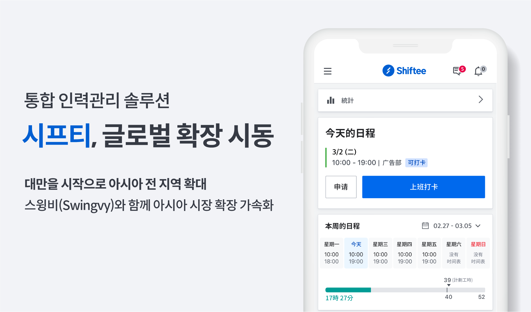 시프티의 신승원 대표는 “시프티가 국내 인력관리 시장을 선도하며 안정적인 영업이익을 창출하고 있는 지금이 글로벌 사업 확장의 적기라고 판단했고, 이번 대만 진출을 시작으로 국내를 넘어 아시아 전역에서 근태관리 및 인력관리 소프트웨어 분야의 독보적인 1등이 되는 것이 목표”라고 말했다.