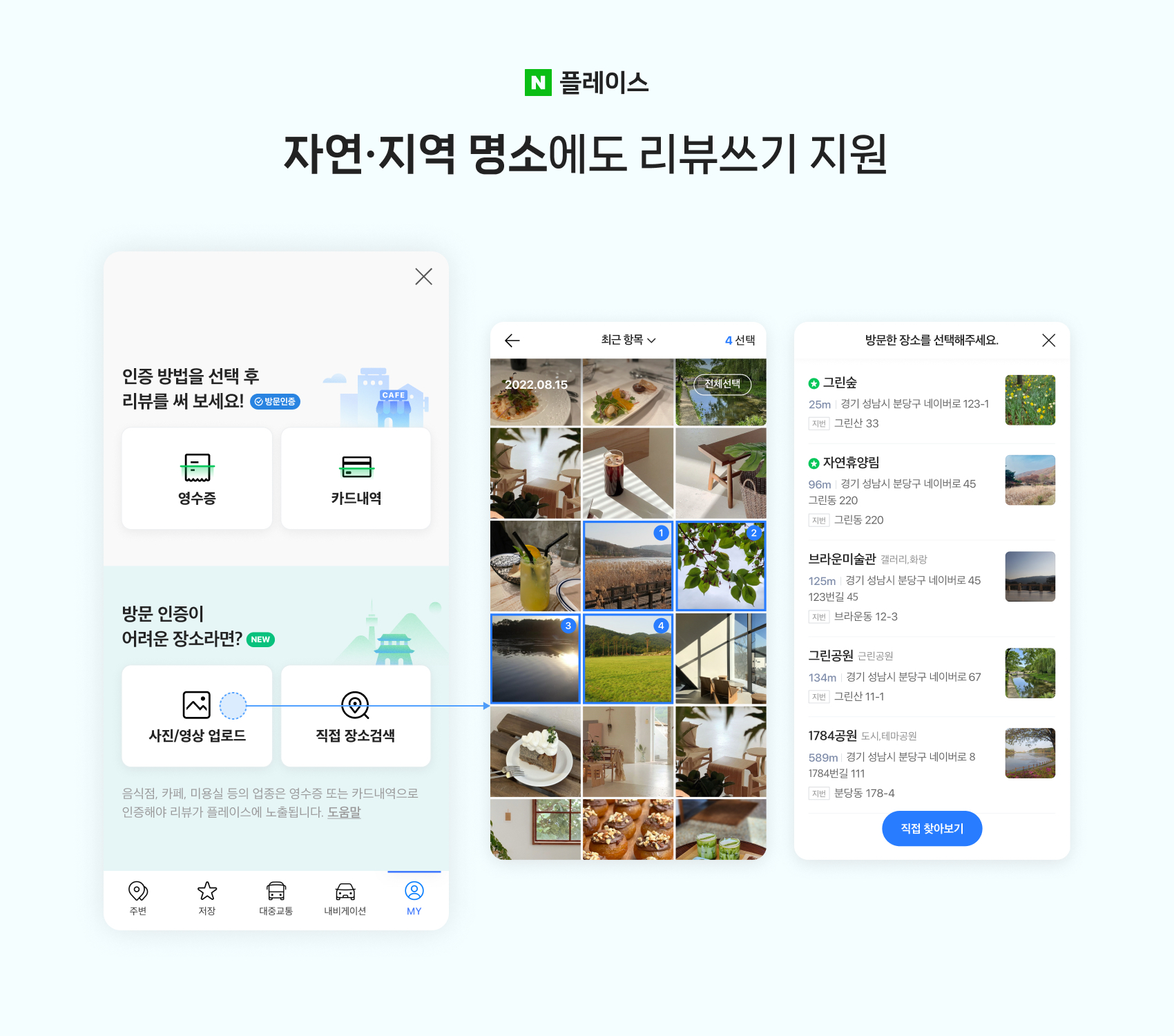 이제 자연·지역 명소에 대해서도 ▲키워드 ▲텍스트 ▲사진·동영상 리뷰와 함께 구체적인 로컬 정보를 만나볼 수 있게 됐다. 이용자들은 MY플레이스에서 방문한 명소를 검색하거나 사진·영상을 업로드하는 방식으로 자유롭게 방문 장소를 기록하고 리뷰를 작성할 수 있다. ▲음식점 ▲카페 ▲미용실 등 결제 내역이 필요한 업종에도 MY플레이스에 방문 경험을 기록하는 차원에서 리뷰를 남길 수 있으며, 영수증 또는 카드 내역을 인증한 리뷰만 플레이스에 노출된다.