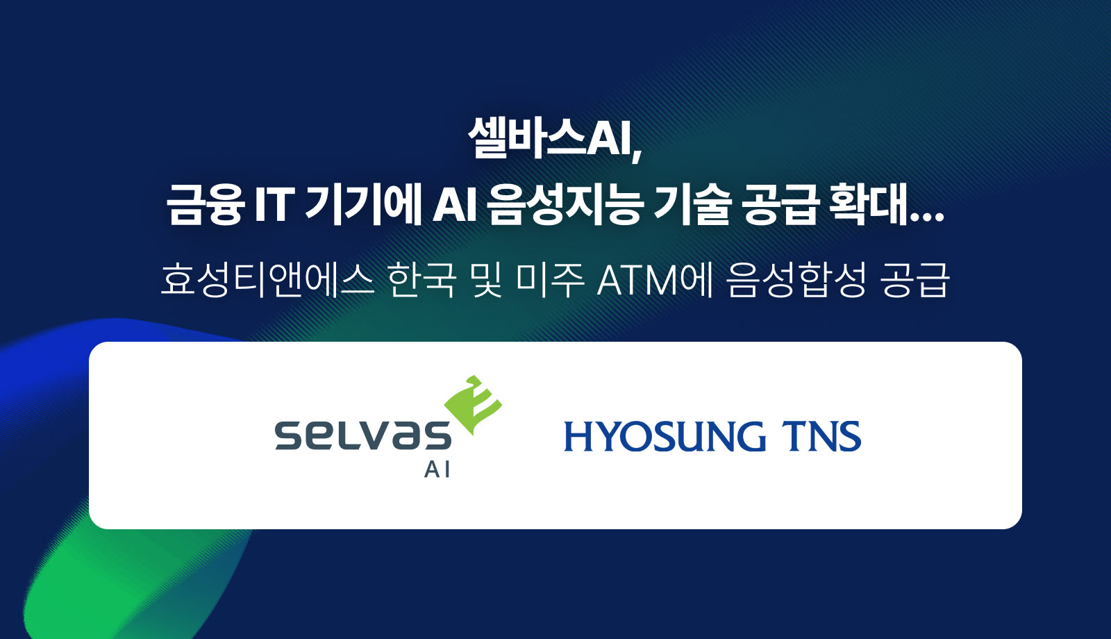 셀바스AI가 효성의 금융전문 IT 솔루션 계열사인 효성티앤에스에 음성합성(Selvy TTS)을 공급했다. 효성티앤에스는 국내 및 미국 ATM 시장 점유율 1위 기업이며, 국내에서는 은행 ATM, 미국에서는 편의점 등 리테일 ATM에 셀바스 AI의 음성합성을 적용했다.