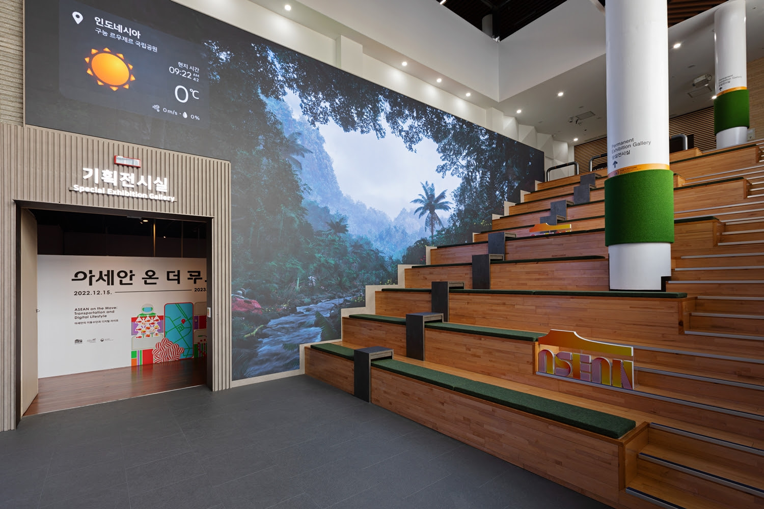 아세안문화원 로비 한 면을 가득 채운 라이브 미디어 월(Wall) ‘함께 호흡하다’는 시공간 한계를 넘어 인도네시아 현지 기후가 3D 디지털 환경에 재현되는 리얼 타임 콘텐츠다. 방문객이 마치 현지에 있는 듯한 현실감을 더하고자 API(응용 프로그램 인터페이스)제공 대표 사이트 오픈웨더맵(OpenWeatherMap)을 통해 구눙 르우제르(Gunung Leuser) 국립공원 날씨 데이터를 실시간으로 반영한 유저 인터페이스(UI)를 구현했다.