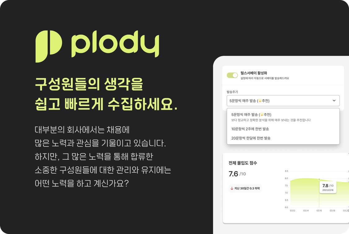 플로디는 임직원 만족도 조사와 조직문화 개선을 지원하는 HR 서베이 SaaS 솔루션으로, 인사 담당자들이 효율적인 조사와 분석을 수행하여 조직 내 문제점을 파악하고 개선할 수 있다. 또한 초기 스타트업에서 인사 업무 담당자가 부재할 경우 리더십 역량 강화에 도움이 되는 서비스를 제공한다. 조직문화 강조와 인재 유치 경쟁이 치열한 상황에서 플로디는 팀 리더들이 조직원들의 목소리를 듣고 이해하여 선제적 조치를 할 수 있도록 지원한다. 이를 통해 기업이 인적 자원 관리를 보다 전문적이고 효율적으로 수행할 수 있도록 돕는다.