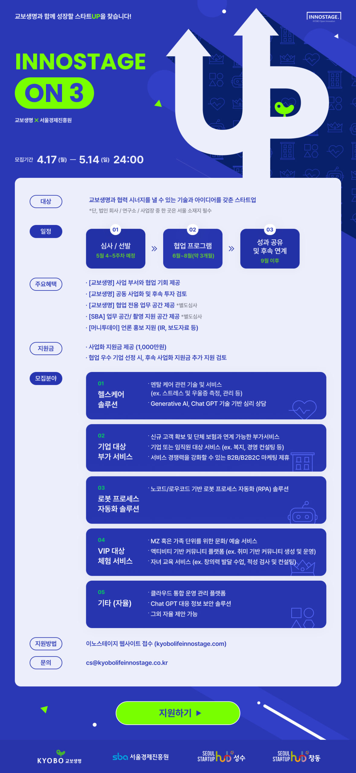 이번 ‘이노스테이지 ON 3’ 프로그램은 서울경제진흥원 (SBA, 서울창업허브 성수와 창동)과 함께 Social 과 Tech 분야의 유망 스타트업 발굴에 힘 쏟을 예정이다. 이에 따라 모집 분야는 크게 (Social 분야) 기업 대상 부가 서비스, VIP 대상 체험 서비스와 (Tech 분야) 헬스케어 솔루션, 로봇 프로세스 자동화 솔루션으로 구성되며, 교보생명과 협업할 수 있는 다양한 아이디어의 자율 제안도 가능하다.