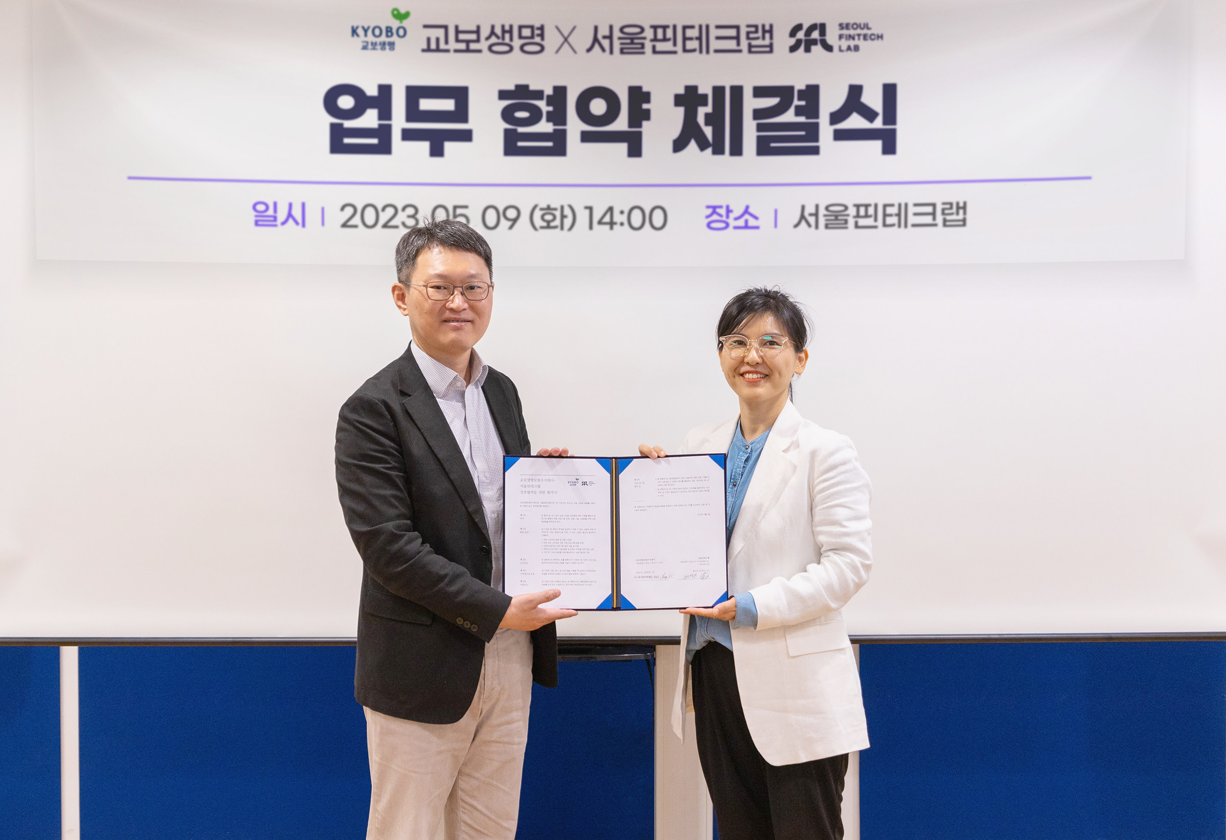 서울핀테크랩과 교보생명이 지난 5월 9일 핀테크 분야 오픈이노베이션 및 투자 촉진을 위해 협약을 체결한다.