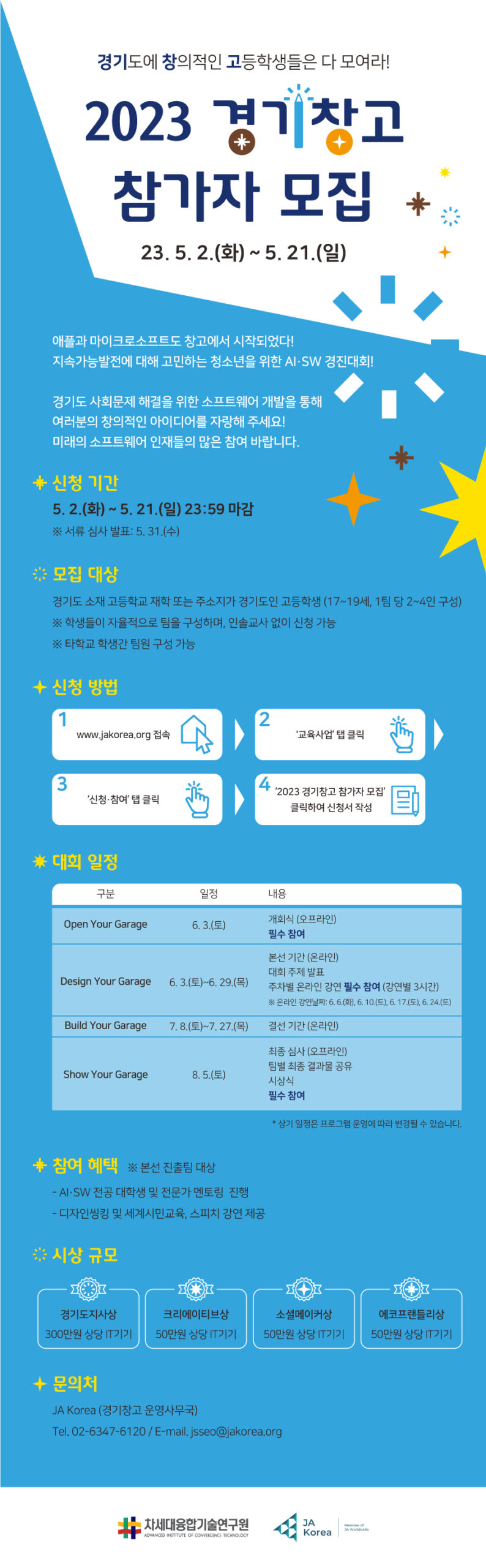 차세대융합기술연구원(이하 융기원)제이에이코리아(국제 청소년 비영리 교육기관)와 함께 경기도 내 고등학생을 대상으로, AI‧SW 경진대회 ‘2023 경기도에 창의적인 고등학생들은 모여라!(이하 경기창고)’를 개최한다.