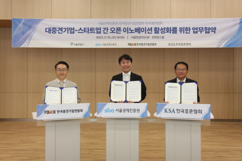대·중소기업과의 오픈이노베이션 등 기업 간 연계와 협력을 기반으로 서울시 혁신 생태계를 조성하는 중소기업 지원기관 서울경제진흥원(SBA, 대표이사 김현우)은 한국중견기업연합회, 한국표준협회와 대·중견기업-스타트업 간 협력 활성화를 위한 3자간 업무협약을 체결했다고 밝혔다.