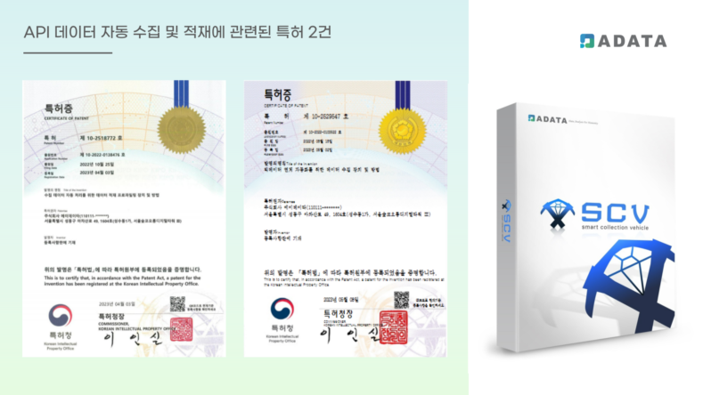 데이터 통합 전문 기업 ‘에이데이타(대표 이동혁)’가 지난 10일 SCV의 핵심 기술인 API 데이터 자동 수집 및 적재에 관련된 특허 2건을 획득했다고 밝혔다.