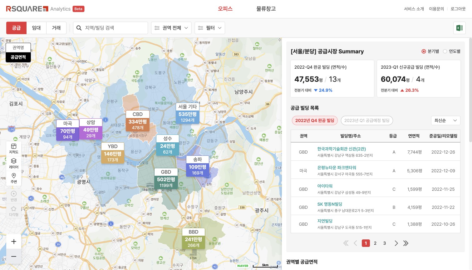 기존 서비스들이 매매 위주의 정보를 담은 것과 달리 알스퀘어는 RA에 공급 추이, 임대 동향, 권역별 임대료, 공실률, 거래 사례 등 과거와 현재의 공급∙임대∙매매 정보를 모두 지도상에 표시한다. 이용자가 원하는 정보를 한눈에 확인할 수 있도록 한 것이다. 추후 물류센터 시장 정보도 체계적으로 분류∙정리해 담을 예정이다.