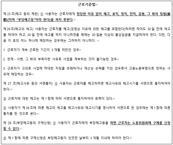 우리나라는 근로기준법 및 판례를 통하여, 근로자를 해고하려는 경우 매우 엄격한 조건을 충족하여야만 가능하도록 하고 있습니다.
