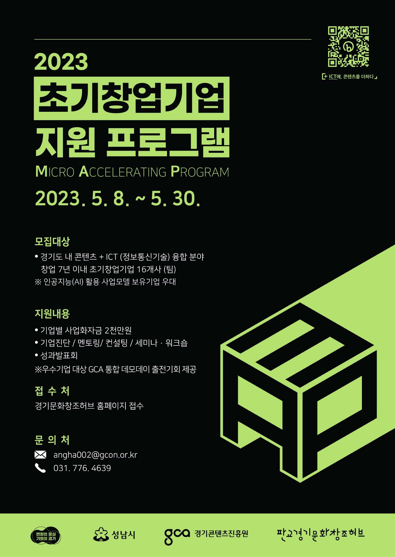 경기콘텐츠진흥원이 ‘2023 초기창업기업 지원 프로그램(Micro Accelerating Program) 2기’ 참여기업을 오는 5월 30일까지 모집한다.