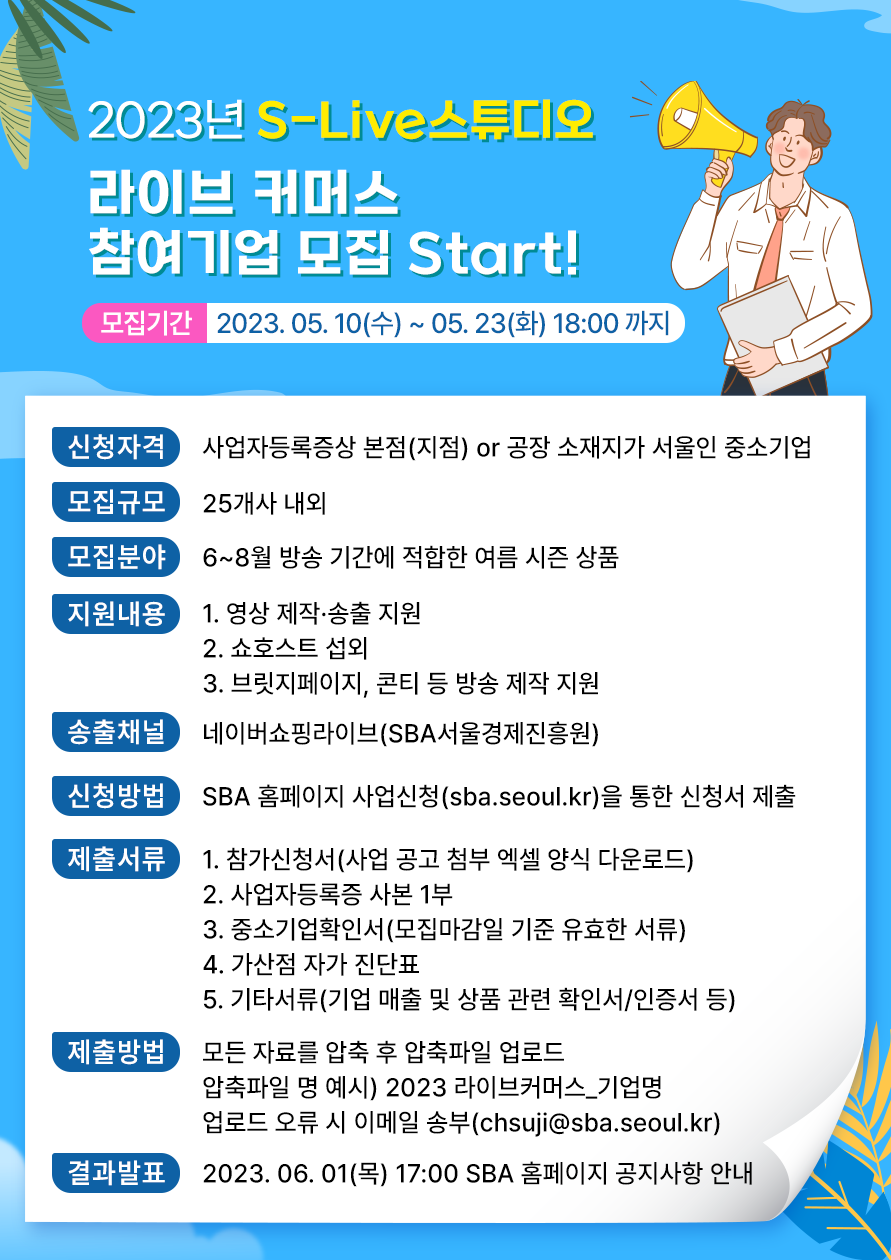 S-Live 스튜디오 기반 기획 라이브커머스 지원사업 참여 기업 모집은 5월 23일까지 진행되며, 모집 규모는 25개사 내외로 선정될 예정이다. 향후 2회차(9~10월 방송), 3회차(11~12월 방송) 사업은 각 시기에 적합한 가을&추석 용품, 겨울&크리스마스 상품 등으로 모집하여 시즌별 특별 라이브 방송을 통해 서울시 우수기업 발굴 및 특화 마케팅을 지원할 예정이다. 모집공고는 SBA 서울경제진흥원 홈페이지를 통해 확인할 수 있다.