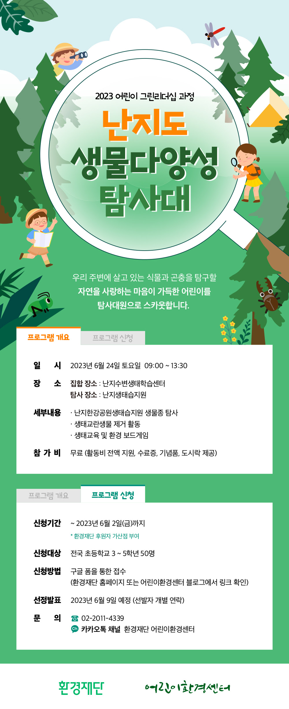 환경재단과 어린이환경센터가 2023년 어린이 그린리더십 과정에 참가할 초등학교 3~5학년 학생 50명을 오는 6월 2일까지 모집한다.