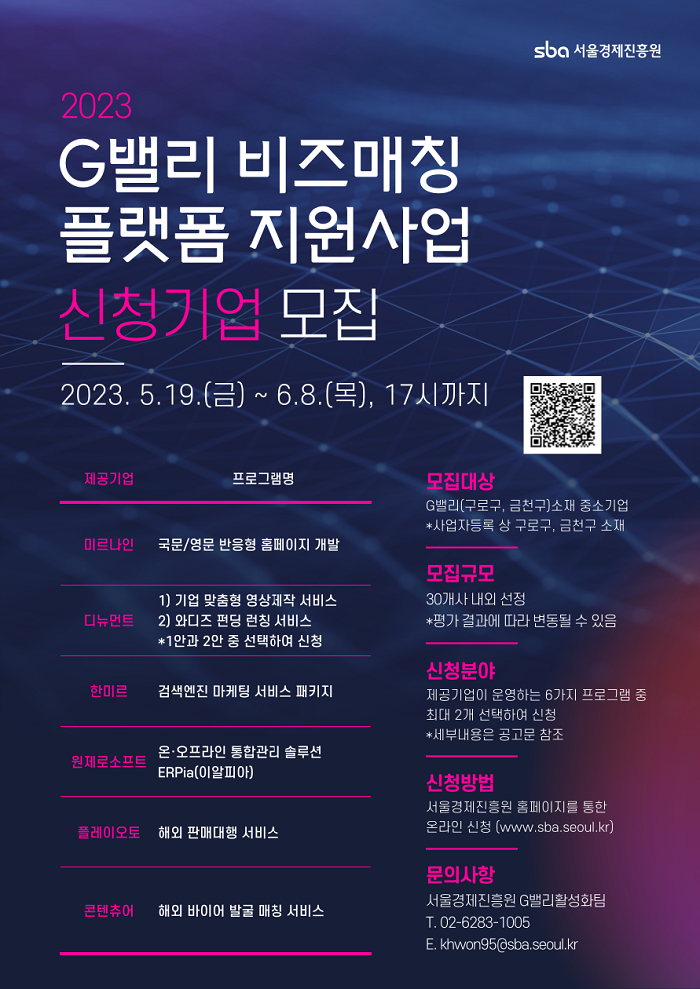 서울시의 경쟁력을 만드는 중소기업 지원기관 서울경제진흥원(舊 서울산업진흥원, SBA)이 G밸리(구로구, 금천구) 기업 간 B2B 거래를 활성화하고자 ‘G밸리 비즈매칭 플랫폼 지원사업’ 신청기업을 모집한다.
