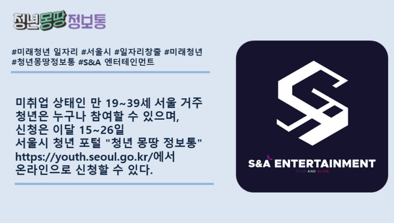 서울시 미래청년 일자리 사업과 MOU를 맺은 온라인 S&A 엔터테인먼트 홍보마케팅 총괄 신은섭 팀장은 이번 서울 미래청년 일자리 사업을 통해 선정된 입사자들은 국낸 90 여명의 아티스트를 보유한 종합 엔터테인먼트사의 최고 수준의 전문가들이 멘토링을 진행할 계획이며 온라인 마케팅, 매니지먼트의 업무에 관하여 체계적인 육성 과정을 거쳐 전 세계에서 가장 이목을 끄는 직종인 아티스트 크리에이터 육성과장의 직무 전문가로 고속 성장할 것 이라며 운영 계획을 밝혔다.