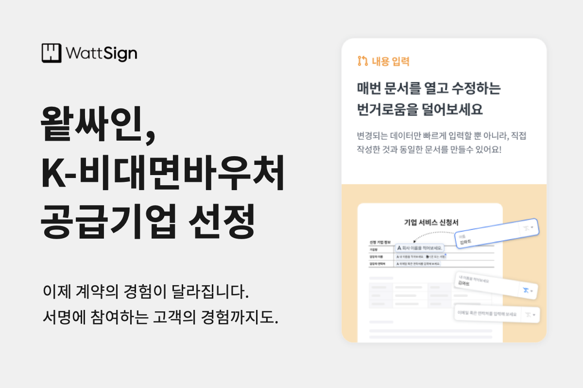 왙싸인 김현준 대표는 “왙싸인은 전자계약 체결뿐 아니라, 반복하여 발생하는 각종 동의서와 신청서의 문서를 매번 작성하는 번거로운 과정에서 벗어날 수 있도록 지원하는 새로운 전자계약 서비스다. 또한 계약 업무의 흐름을 수요기업의 App 서비스 혹은 내부 서비스와 연계하여 별도의 구축없이 손쉽게 연계하는 WattSign API를 별도의 약정 없이 비대면 서비스바우처 등록만으로도 사용할 수 있어 보다 중요한 업무에 집중할 수 있도록 왙싸인이 지원하겠다”라고 말했다.