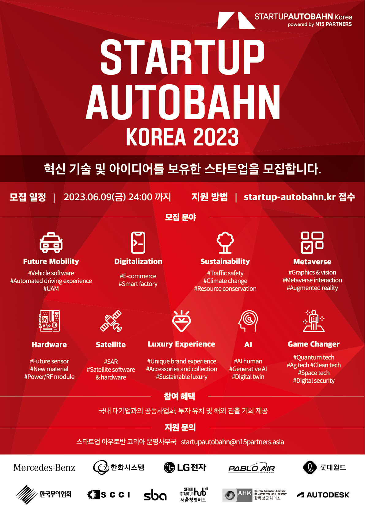 한국에서는 2020년에 처음 개최되어 햇수로 4년차를 맞이하는 ‘스타트업 아우토반 코리아 2023’에서는 ▲미래 모빌리티 디지털 전환 ▲지속가능성 ▲메타버스 ▲인공지능 ▲위성 ▲하드웨어 ▲럭셔리 경험 ▲게임 체인저 총 9가지 분야에서 우수 역량을 가진 스타트업을 선발한다.