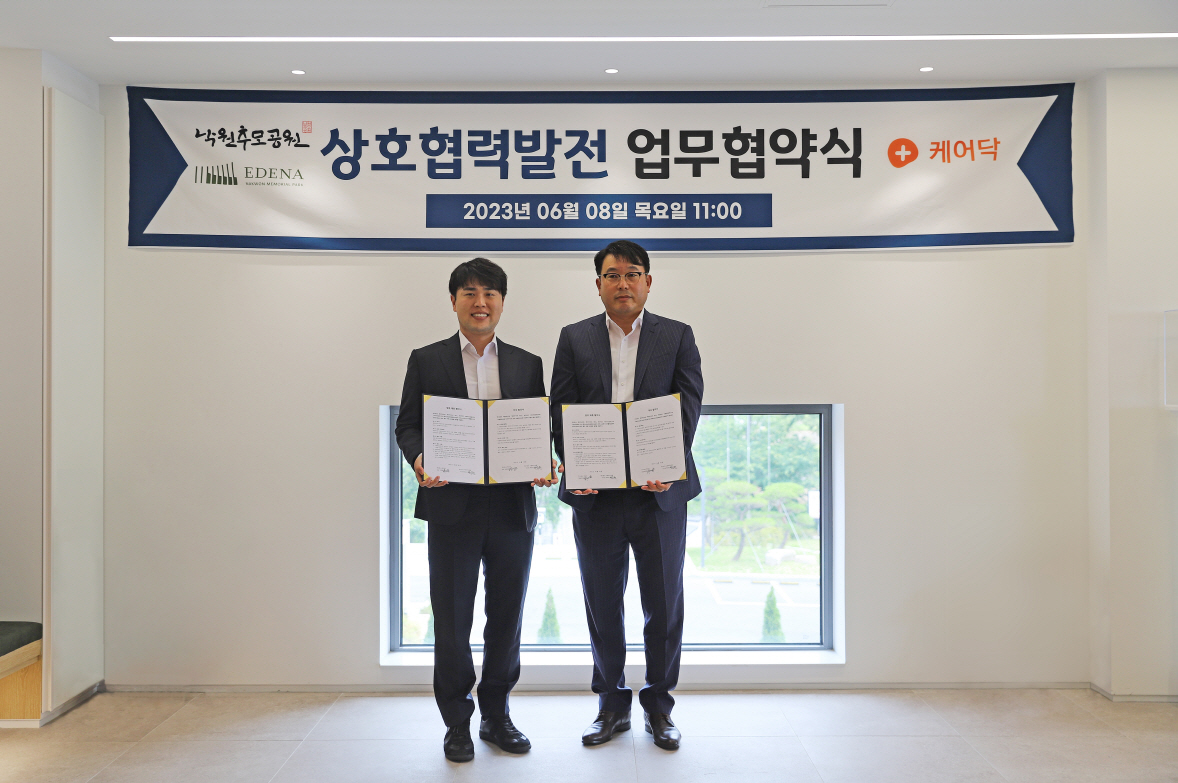 시니어 토탈 케어 플랫폼 케어닥이 경남권 최대 규모의 낙원추모공원이 운영하는 프리미엄 봉안당 ‘에데나’와 8일 업무협약(MOU)을 체결했다.