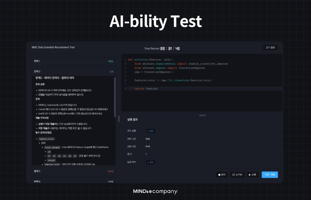 이번에 마인즈앤컴퍼니가 정식으로 출시한 AI-bility Test는 AI 개발자, 데이터 사이언티스트 등 인공지능(AI) 전문 인력의 역량을 확인할 수 있도록 마련된 AI 인력 역량 검증 코딩테스트다. 마인즈앤컴퍼니가 운영하고 있는 데이터 사이언스 플랫폼 AI커넥트(AI CONNECT)가 누적상금 100억원 상당의 AI 경진대회를 꾸준히 유치해 온 경험과 노하우를 바탕으로, 5년 간 100개 이상의 AI 프로젝트를 수행해 온 마인즈앤컴퍼니의 AI 전문가 집단이 테스트를 직접 설계했다. 기본적인 코딩 실력 검증에 초점이 맞춰져 있는 일반 개발 코딩 테스트나 AI 관련 지식을 측정하는 자격증 시험과는 달리, 데이터 처리부터 모델링 역량에 이르기까지 실제 현업에서 요구하는 AI 프로젝트를 수행할 수 있는지 확인할 수 있도록 구성된 점이 특징이다. 기업의 AI 관련 인력 채용은 물론, 다양한 교육 프로그램 이수 및 성취도 평가 등 다양하게 활용될 수 있다.