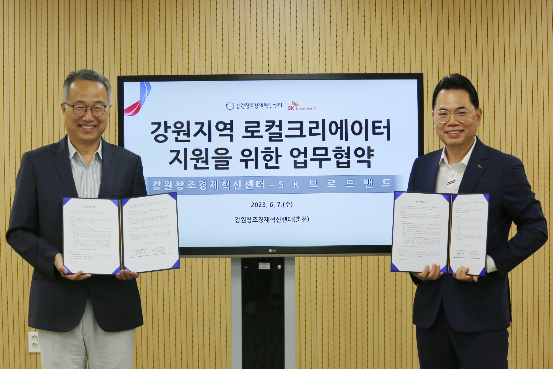 강원창조경제혁신센터(이하 강원혁신센터)와 SK브로드밴드가 지난 7일 강원혁신센터 춘천 본원에서 ‘강원지역 로컬크리에이터 지원을 위한 업무협약’을 체결했다.