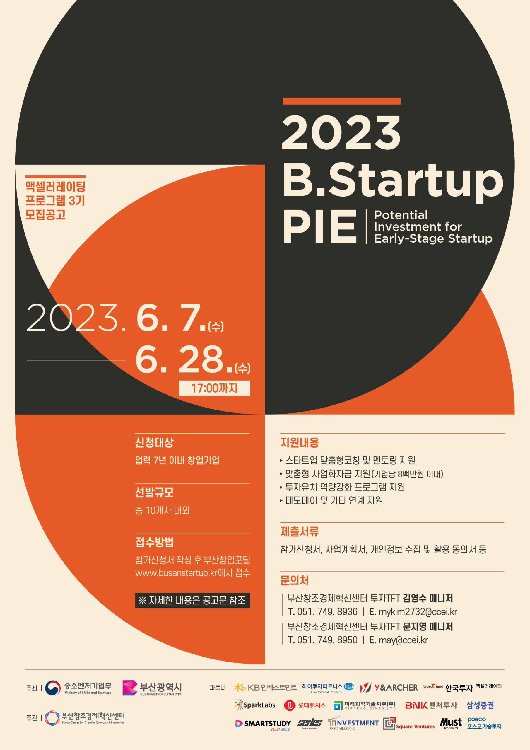 부산창조경제혁신센터(이하 부산창경)가 초기 스타트업을 대상으로 기술·서비스 고도화 지원 및 투자유치 기회를 마련하는 ‘2023 B.Startup PIE 액셀러레이팅 프로그램 3기’에 참여할 스타트업 기업을 오는 28일까지 모집한다.